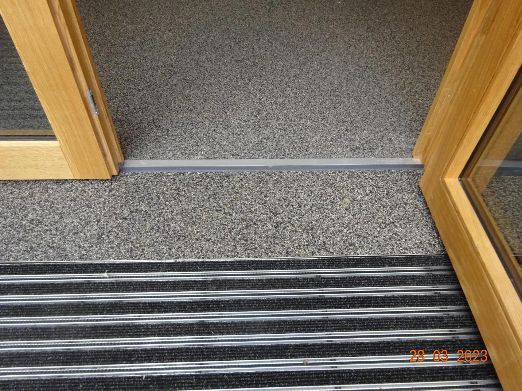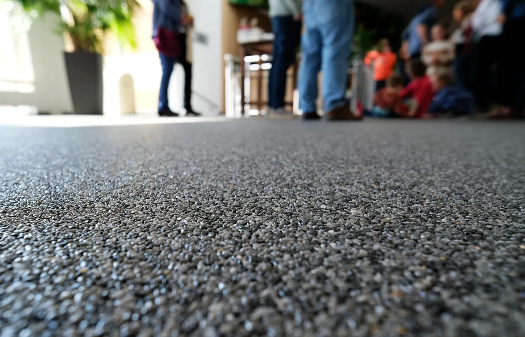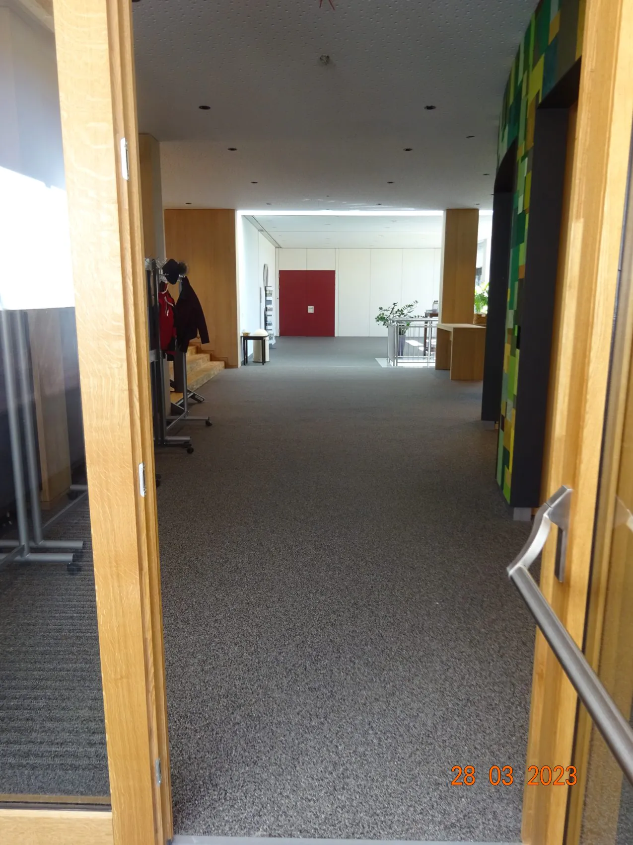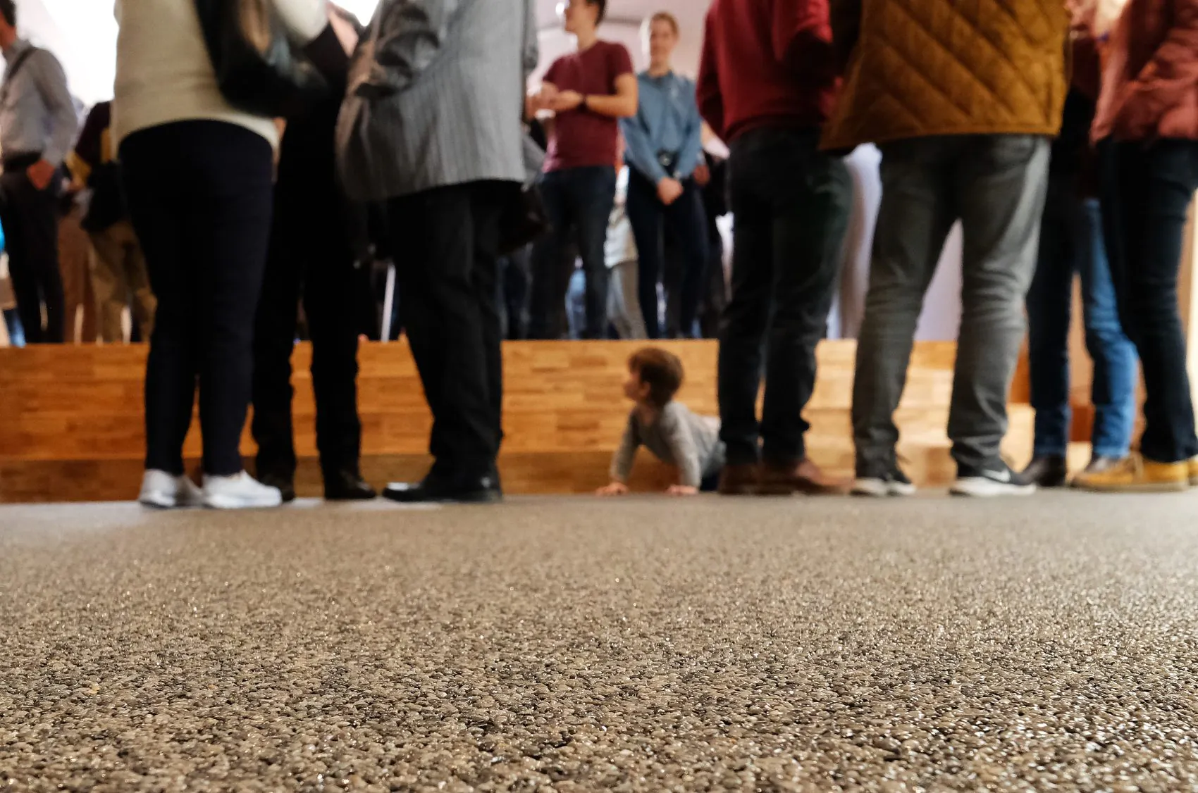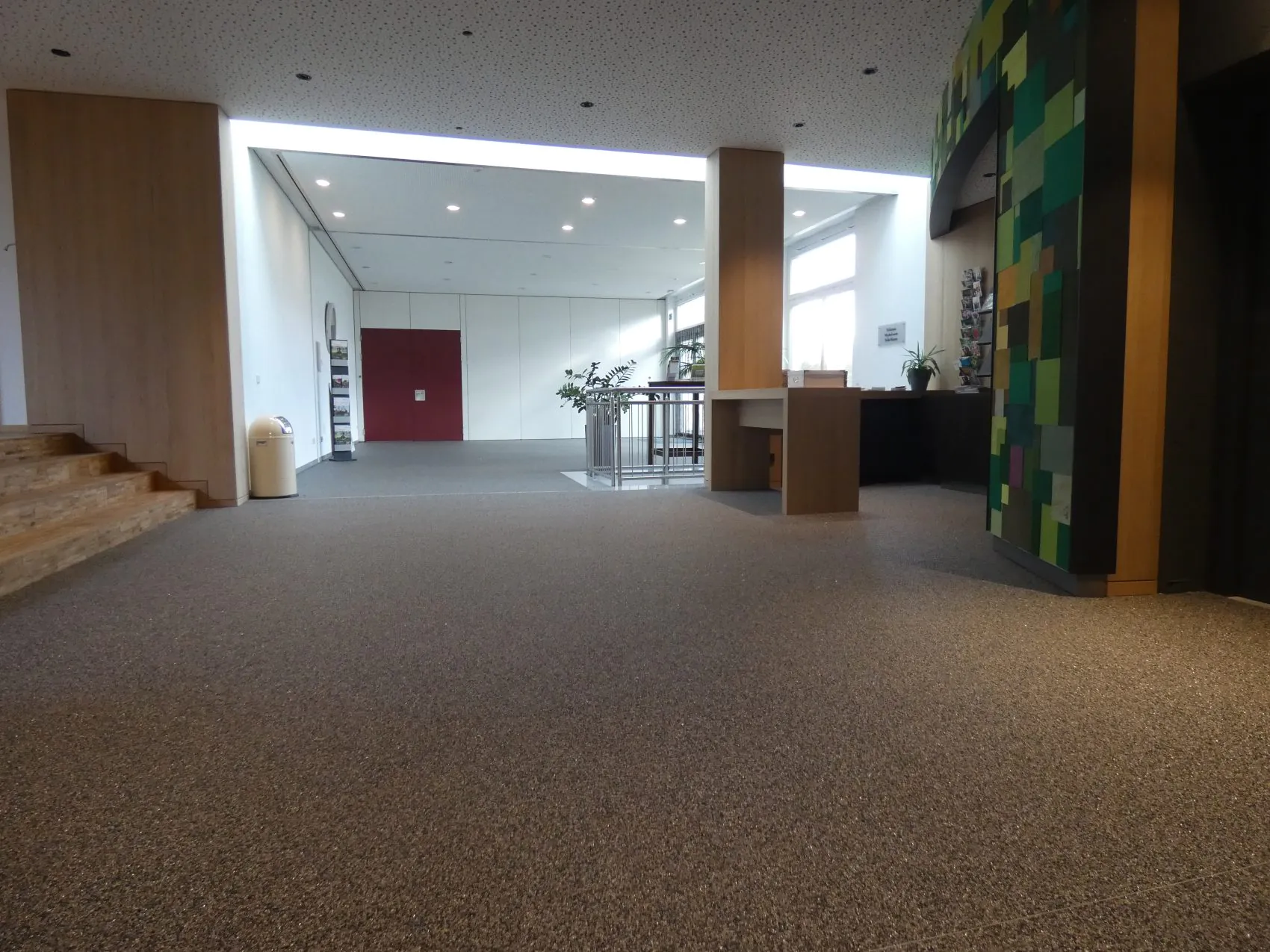 Das perfekte Zusammenspiel von RAVELLO Steinteppich mit Echtholzparkett. Im Gemeindehaus Lindenwiese waren mehrere unterschiedliche Bauwerke und Höhen anzugleichen. Vorher waren unterschiedliche Höhen, Stufen und Stolperkanten hinderlich und unschön. Kein anderes Material, kein anderes Produkt kann diese unterschiedlichen Bausysteme zusammenführen zu einer fugenlosen und homogenen Gesamtfläche.