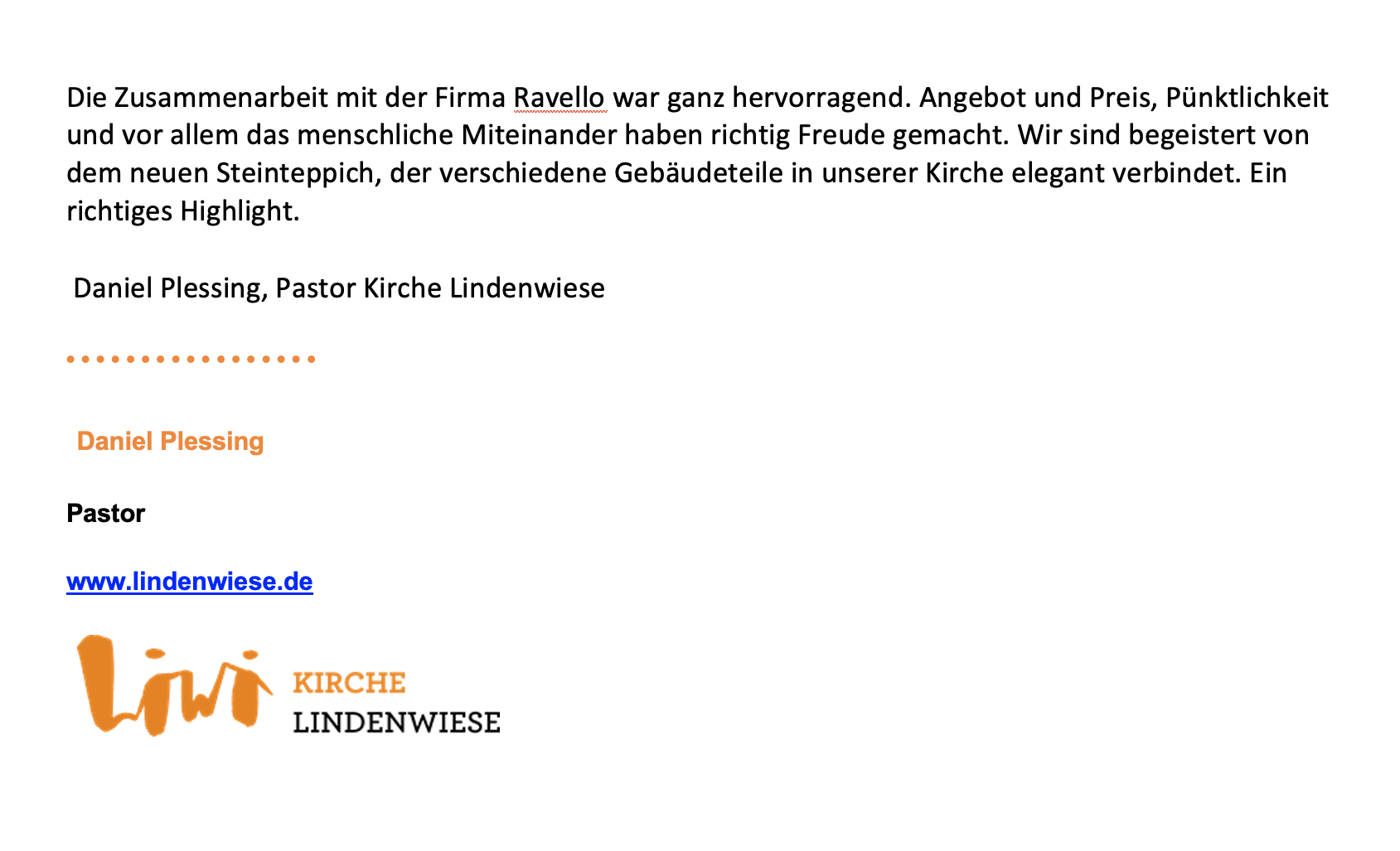 “Die Zusammenarbeit mit der Firma RAVELLO war ganz hervorragend. Angebot, Preis, Pünktlichkeit und vor allem das menschliche Miteinander haben richtig Freude gemacht. Wir sind begeistert von dem neuen Steinteppich, der verschiedene Gebäudeteile in unserer Kirche elegant verbindet. Ein richtiges Highlight.